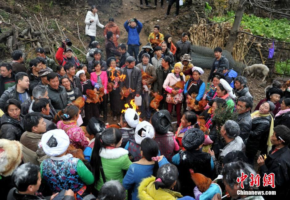 Villagers make wishes in front of the Buddha paintings, each holding a rooster in arms. (Chinanews/Liu Zhongjun)
