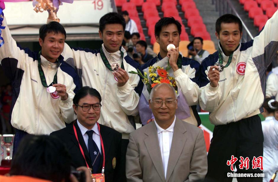 Nov. 23, 2001 - He Zhenliang (front right), President of the IOC of China alongside Timothy Fok, President of the IOC of Hong Kong, as they present four athletes from Hong Kong with silver medals at the 9th National Games. (CNS/Mao Jianjun)