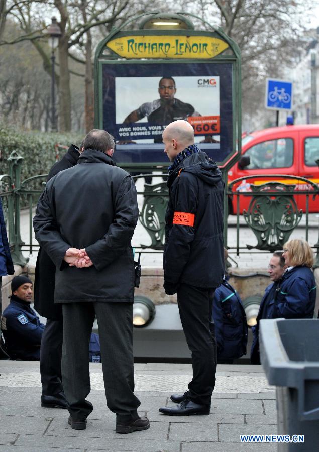 The subway station near the Paris office of Charlie Hebdo is closed in Paris, France, Jan. 7, 2015. The office of Paris Prosecutor of the Republic confirmed at least 12 people were killed on Wednesday in a shooting at the Paris office of Charlie Hebdo, a satirical newspaper, adding four others were seriously wounded in the "terror attack." (Xinhua/Chen Xiaowei)
