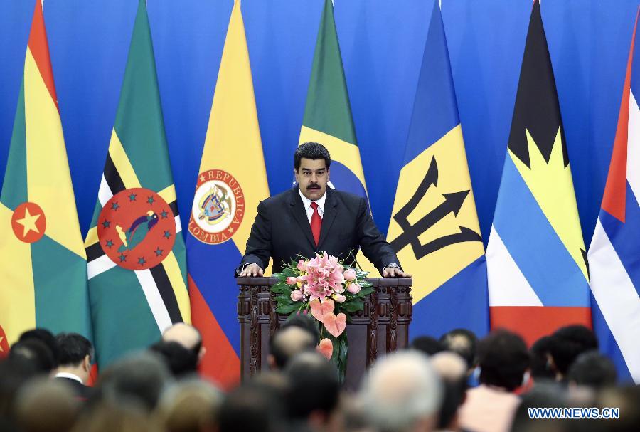 Venezuelan President Nicolas Maduro speaks during the opening ceremony of the first ministerial meeting of the Forum of China and the Community of Latin American and Caribbean States (CELAC) in Beijing, capital of China, Jan. 8, 2015.(Xinhua/Ding Lin)
