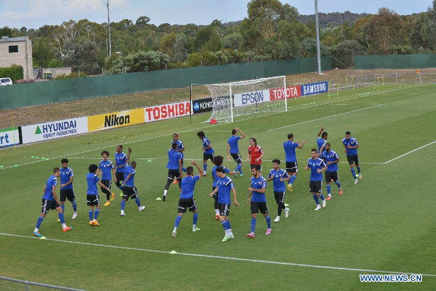 Players of the United Arab Emirates (UAE) national team attend a training session ahead of the AFC Asian Cup in Canberra, Australia, Jan. 7, 2015. The UAE's first match at this Asian Cup will be against Qatar in Canberra on Jan. 11, 2015. (Xinhua/Justin Qian)