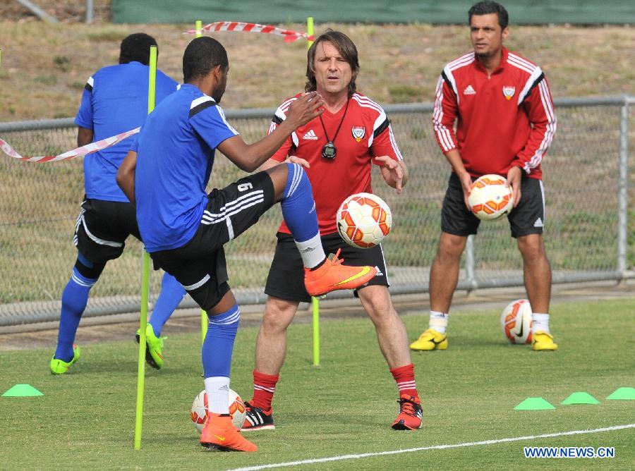 Players of the United Arab Emirates (UAE) national team attend a training session ahead of the AFC Asian Cup in Canberra, Australia, Jan. 7, 2015. The UAE's first match at this Asian Cup will be against Qatar in Canberra on Jan. 11, 2015. (Xinhua/Justin Qian)
