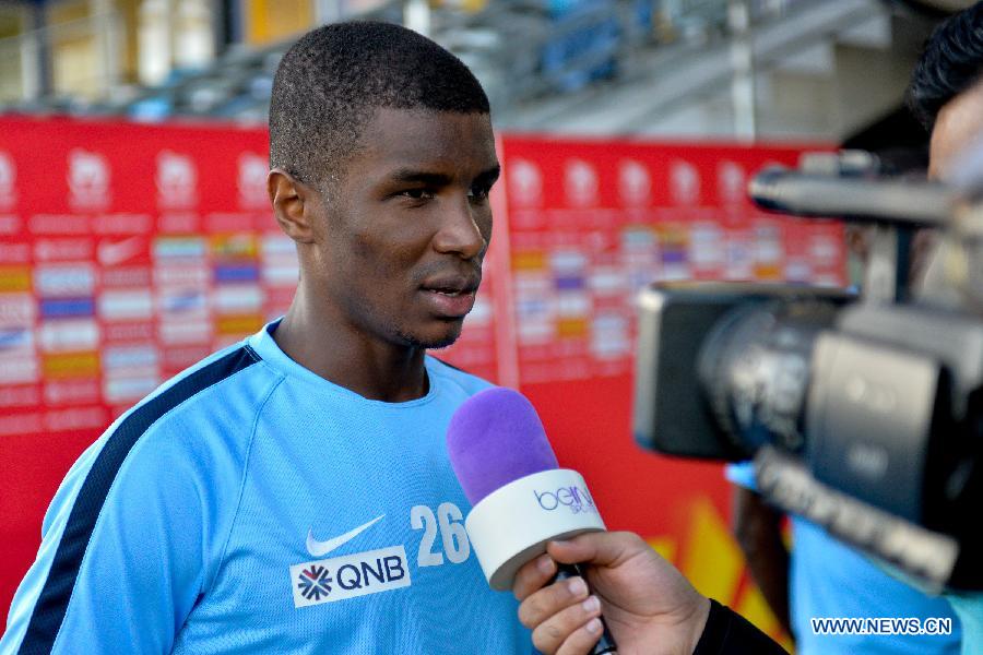 | Bilal Mohammed of Qatar soccer team speaks to media before a training session ahead of the AFC Asian Cup in Canberra, Australia, Jan. 7, 2015. (Xinhua/Justin Qian) |