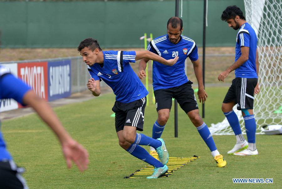 Players of the United Arab Emirates (UAE) national team attend a training session ahead of the AFC Asian Cup in Canberra, Australia, Jan. 7, 2015. The UAE's first match at this Asian Cup will be against Qatar in Canberra on Jan. 11, 2015. (Xinhua/Justin Qian)