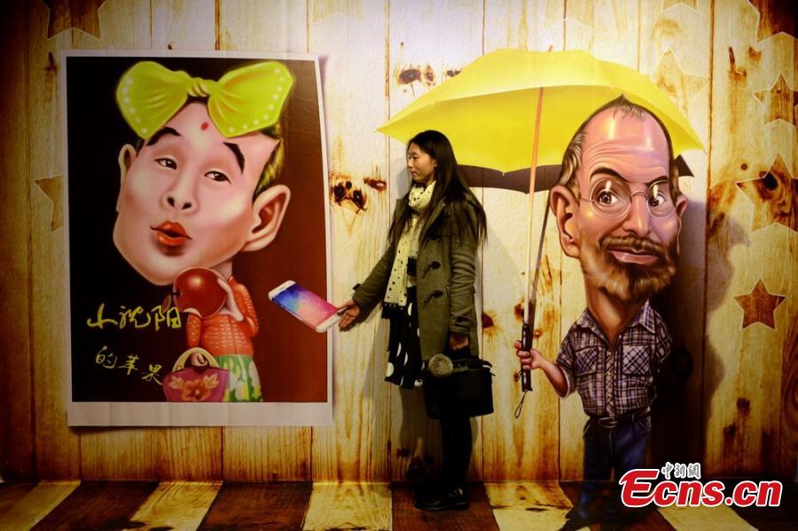 Visitors pose for a photo inside a room that uses 3D paintings to create optical illusions in Suzhou, east China's Jiangsu province on Jan. 7, 2015. The 3D painting exhibition also combines light show, art installations and sculptures. (CNS/Wang Sizhe)