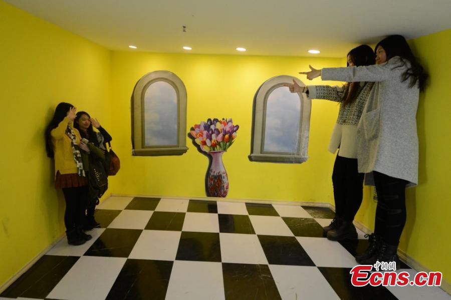 Visitors pose for a photo inside a room that uses 3D paintings to create optical illusions in Suzhou, east China's Jiangsu province on Jan. 7, 2015. The 3D painting exhibition also combines light show, art installations and sculptures. (CNS/Wang Sizhe)