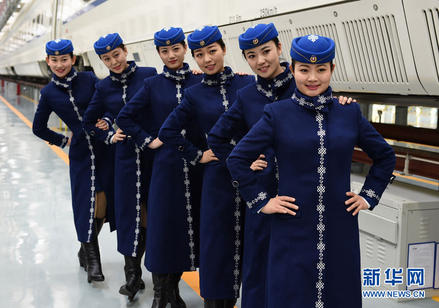 Female train attendants who will work on Inner Mongolia’s first bullet train pose for photos in navy blue uniforms with Mongolian style design on Jan. 6, 2015. The first CRH (China Railway High-speed) train in Inner Mongolia will be put into operation on Jan. 8, 2014. (Xinhua/ Wang Zheng)