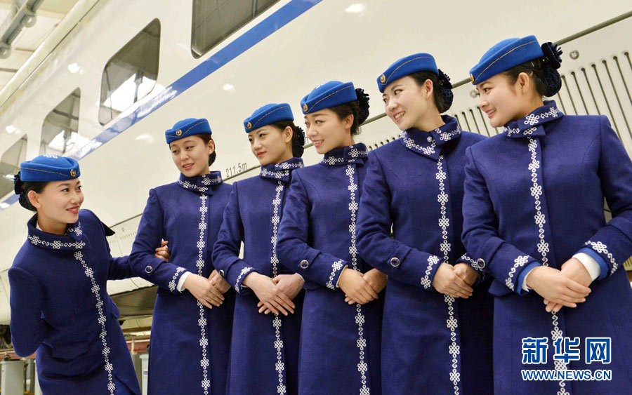 Female train attendants who will work on Inner Mongolia’s first bullet train pose for photos in navy blue uniforms with Mongolian style design on Jan. 6, 2015. The first CRH (China Railway High-speed) train in Inner Mongolia will be put into operation on Jan. 8, 2014. (Xinhua/ Wang Zheng)