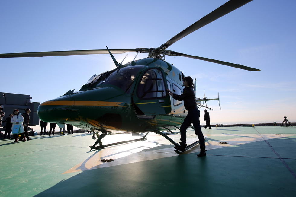 A Bell 429 helicopter lands on the parking apron of the 330-meter-high China World Trade Center Tower 3 on Jan. 6, 2015, which signifies that the highest parking apron in Beijing officially came into use. On that day, two other helicopters also landed on this parking apron. (Beijing News/Li Dong)