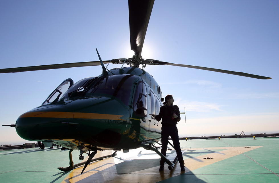 | A Bell 429 helicopter lands on the parking apron of the 330-meter-high China World Trade Center Tower 3 on Jan. 6, 2015, which signifies that the highest parking apron in Beijing officially came into use. On that day, two other helicopters also landed on this parking apron. (Beijing News/Li Dong) |