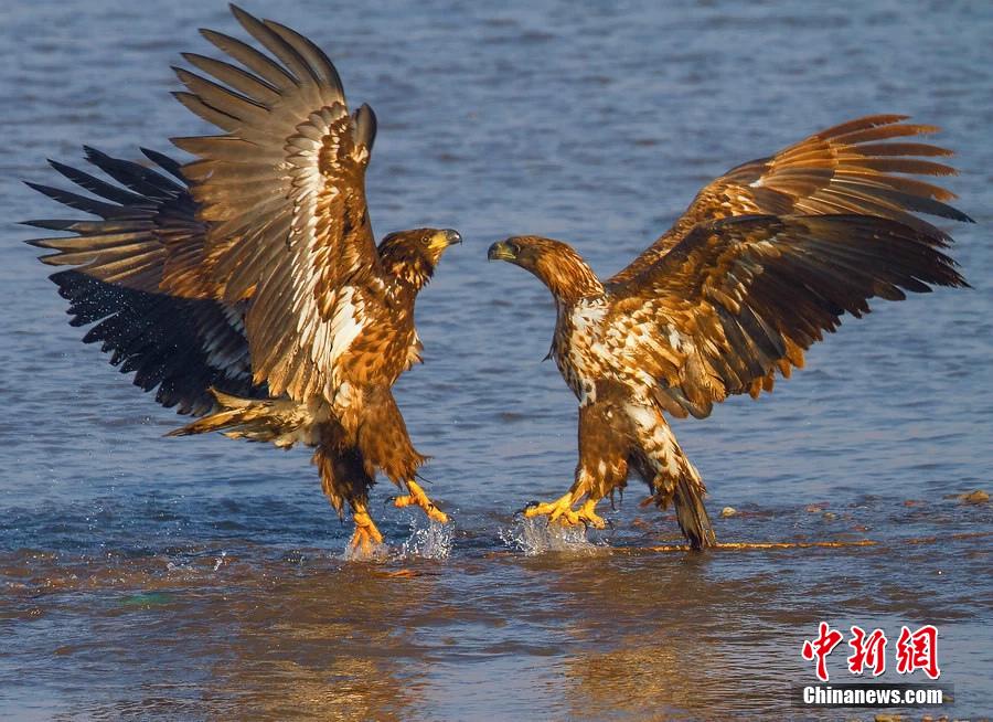 Photo shows the white-tailed eagles fishing in Yili, northwest China's Xinjiang autonomous region in winter. Some ducks and stray dogs nearby also came to share the food of the eagles. Thanks to the recovery of the ecologic environment of Ili River Basin, more and more white-tailed eagles come to spend winter there. (CNS/Yang Yongguang)