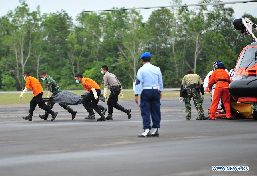Members of the National Search And Rescue Agency unload the body of a victim of AirAsia Flight QZ8501 from a helicopter at Iskandar Air Force Base, in Pangkalan Bun, Indonesia, Jan. 8, 2015. (Xinhua/Zulkarnain)