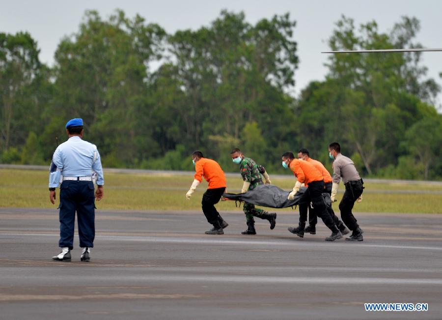 | Rescuers carry the body of a victim of AirAsia flight QZ8501 to a transport plane in Pangkalan Bun, Indonesia, on Jan. 8, 2015. So far, 44 bodies have been discovered by a multinational search team. (Xinhua/He Changshan) |
