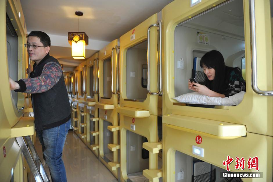 Tourists rest in their rooms in a capsule hotel in Taiyuan, Shanxi province on Jan. 7, 2014. The capsule hotel is popular among tourists and college students because the ongoing urban village reconstruction project in the city has reduced the rental housing resources on market. (CNS/ Wei Liang)