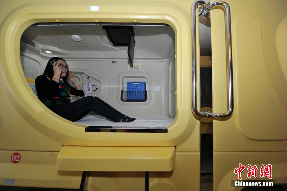 Tourists rest in their rooms in a capsule hotel in Taiyuan, Shanxi province on Jan. 7, 2014. The capsule hotel is popular among tourists and college students because the ongoing urban village reconstruction project in the city has reduced the rental housing resources on market. (CNS/ Wei Liang)