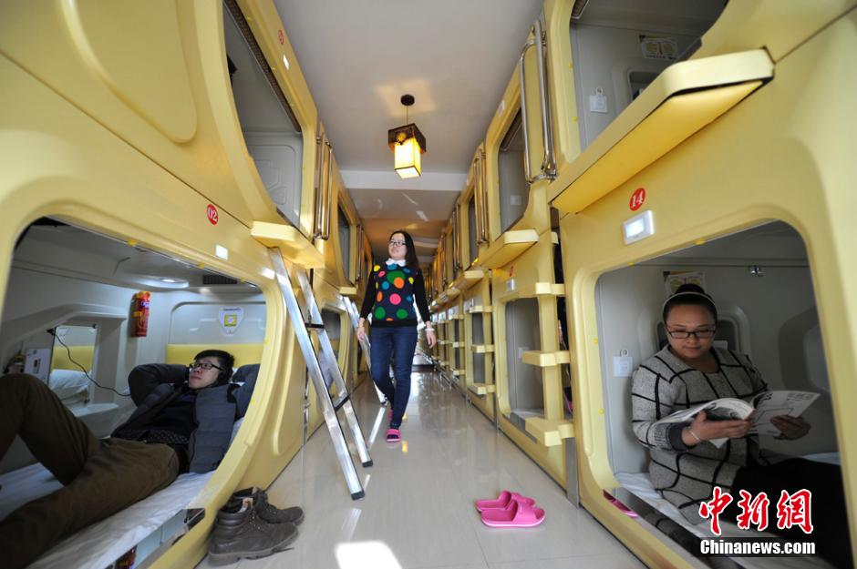 | Tourists rest in their rooms in a capsule hotel in Taiyuan, Shanxi province on Jan. 7, 2014. The capsule hotel is popular among tourists and college students because the ongoing urban village reconstruction project in the city has reduced the rental housing resources on market. (CNS/ Wei Liang) |