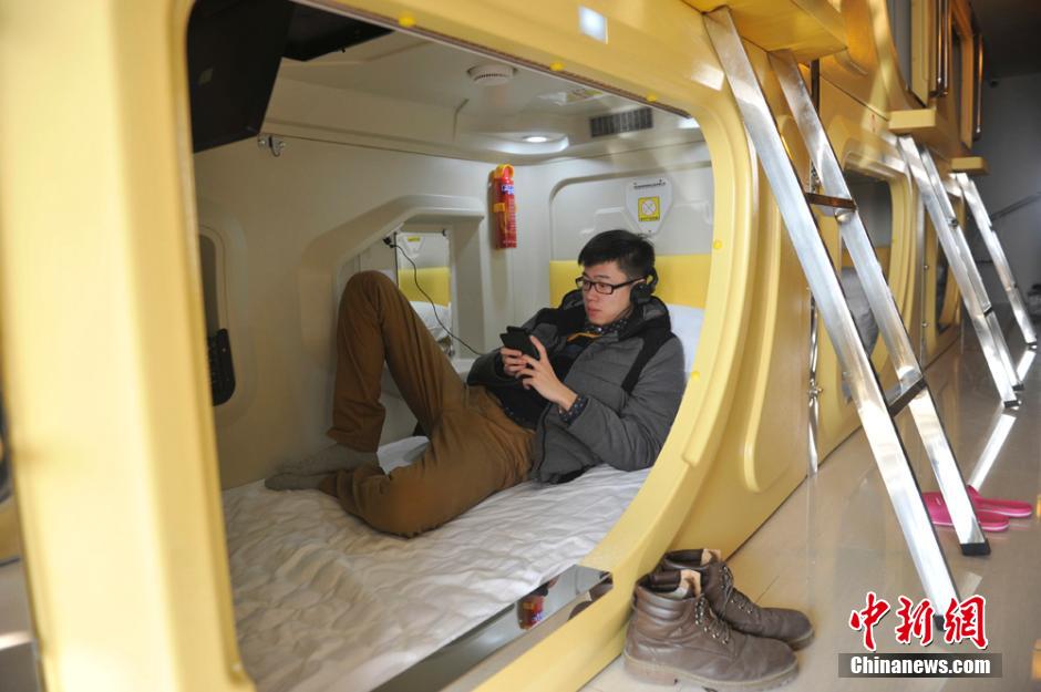 Tourists rest in their rooms in a capsule hotel in Taiyuan, Shanxi province on Jan. 7, 2014. The capsule hotel is popular among tourists and college students because the ongoing urban village reconstruction project in the city has reduced the rental housing resources on market. (CNS/ Wei Liang)