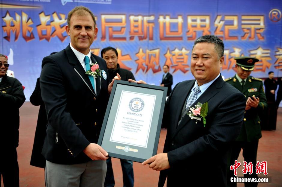 Guinness representative John Garland declares the show the largest Wing Chun display, Jan. 8, 2015. (CNS/Liu Zhongjun)