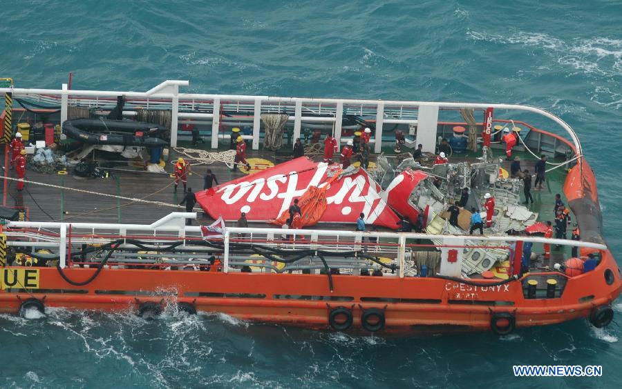 The tail section of crashed AirAsia flight QZ8501 is hoisted from the Java Sea, in Indonesia, Jan. 10, 2015. The tail section of crashed AirAsia flight QZ8501 was hoisted from the Java Sea off Indonesia's Central Kalimantan coast on Saturday as weather condition in the search area improved. (Xinhua)