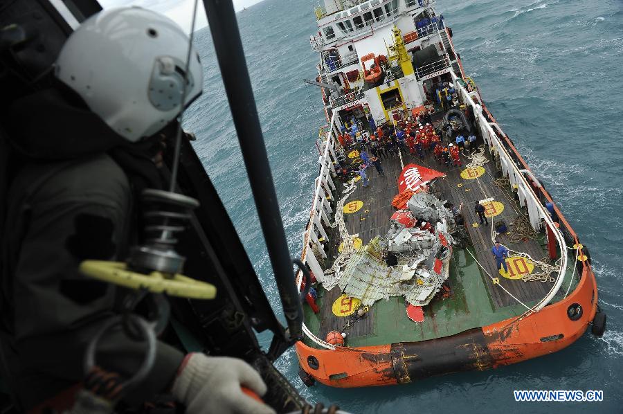 The tail section of crashed AirAsia flight QZ8501 is hoisted from the Java Sea, in Indonesia, Jan. 10, 2015. The tail section of crashed AirAsia flight QZ8501 was hoisted from the Java Sea off Indonesia's Central Kalimantan coast on Saturday as weather condition in the search area improved. (Xinhua)