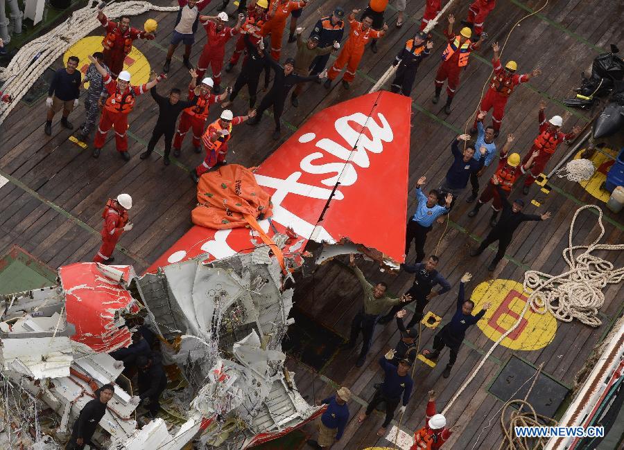 The tail section of crashed AirAsia flight QZ8501 is hoisted from the Java Sea, in Indonesia, Jan. 10, 2015. The tail section of crashed AirAsia flight QZ8501 was hoisted from the Java Sea off Indonesia's Central Kalimantan coast on Saturday as weather condition in the search area improved. (Xinhua)