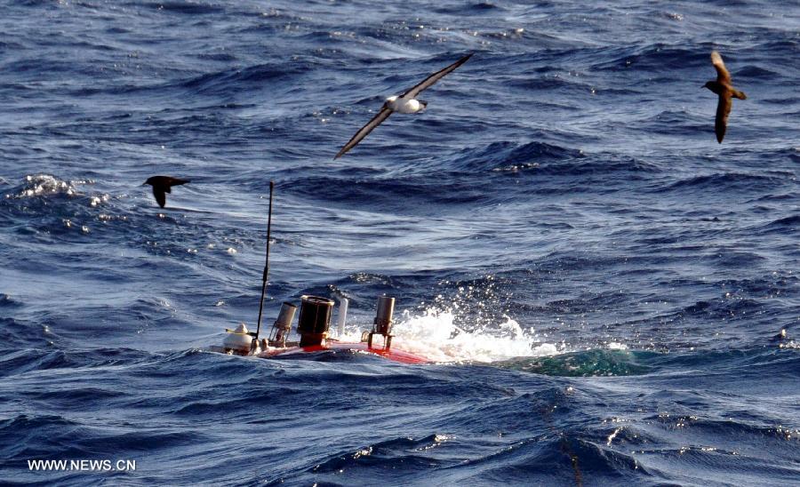 China's deep-sea manned submersible Jiaolong comes out of water as sea birds take flight around it in the southwest Indian Ocean, Jan. 10, 2015. Jiaolong carried out an exploration mission to study active hydrothermal vent in the southwestern Indian Ocean. (Xinhua/Zhang Xudong)