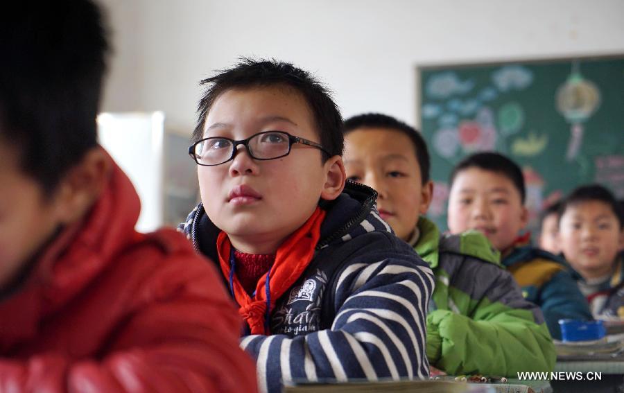 Mo Shuangyi attends a school lesson in Tonggu County of Yichun, east China's Jiangxi Province, Jan. 9, 2015. After his father was diagnosed with leukemia in October 2014, Shuangyi, a 10-year-old schoolboy in Tonggu County, decided to collect recyclable wastes and sell them for money in order to save his father, who thought of giving up treatment because of high medical costs. His filial deeds caught extensive attention when pictures of him collecting wastes spread on the Internet. Shuangyi's family received public donations and a series of subsidies from local authorities soon after. The boy has now returned to school to focus on his education. (Xinhua/Chen Zixia)
