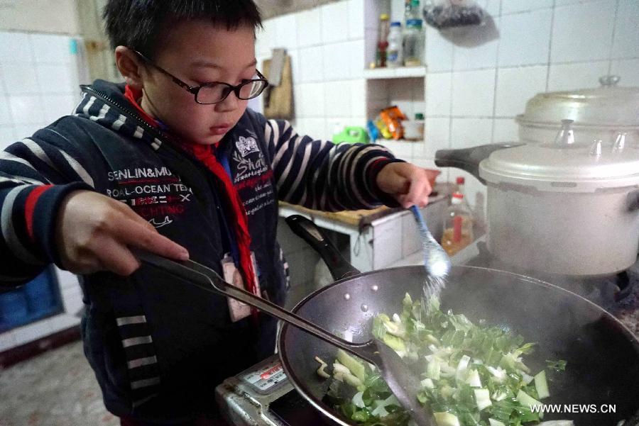 Mo Shuangyi prepares dinner at his home in Tonggu County of Yichun, east China's Jiangxi Province, Jan. 9, 2015. After his father was diagnosed with leukemia in October 2014, Shuangyi, a 10-year-old schoolboy in Tonggu County, decided to collect recyclable wastes and sell them for money in order to save his father, who thought of giving up treatment because of high medical costs. His filial deeds caught extensive attention when pictures of him collecting wastes spread on the Internet. Shuangyi's family received public donations and a series of subsidies from local authorities soon after. The boy has now returned to school to focus on his education. (Xinhua/Chen Zixia)