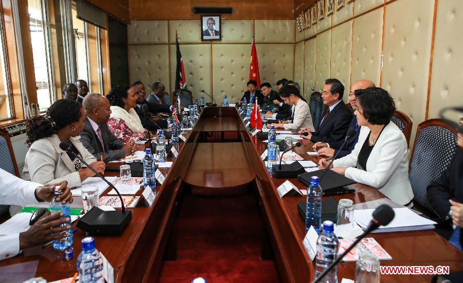 Chinese Foreign Minister Wang Yi (3rd R) holds talks with his Kenyan counterpart Amina Mohamed in Nairobi, capital of Kenya, Jan. 10, 2015. (Xinhua/Meng Chenguang)