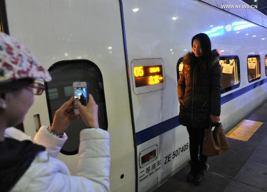 A passenger living in Yanjiao Township, Sanhe City of north China's Hebei Province, poses for photos after arriving at Beijing Railway Station by a high-speed train in Beijing, capital of China, Jan. 12, 2015. It took passengers only half an hour by the high-speed railway from their living place in Beijing's neighboring area to their working place in Beijing. The train, which was put into service on Monday, only ran at rush hour in every morning and evening, offering convenience to workers. (Xinhua/Li Wen)