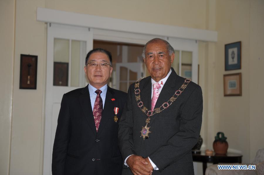 | Fijian President Ratu Epeli Nailatikau (R) poses for photos with Chinese Ambassador to Fiji Huang Yong after awarding him the Honorary Officer of the Order of Fiji under the Fiji Honours System in Suva, Fiji, Jan. 12, 2015. Nailatikau thanked Huang Yong for the continuous efforts in strengthening relations between Fiji and China during his three and half-year term in Fiji. (Xinhua/Michael Yang) |