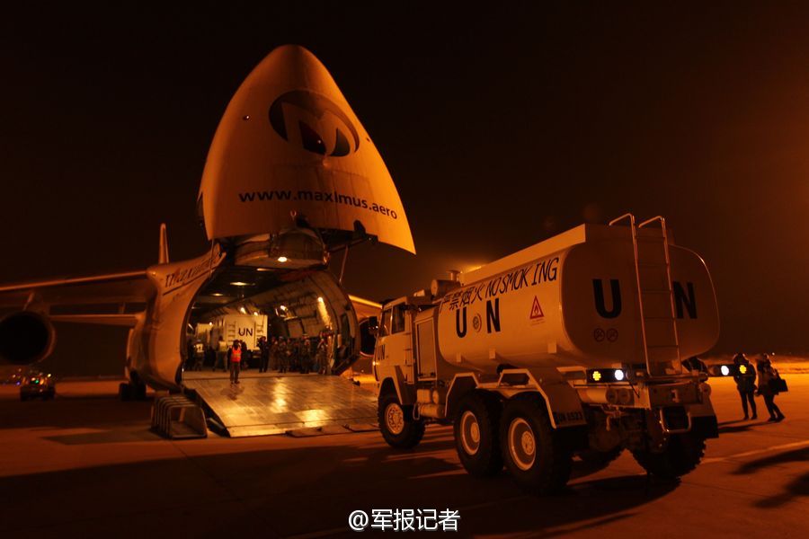 China's first team of peacekeeping battalion departs from east China's Shandong province, Jan. 8, 2015. The team consists of 24 soldiers. Six flew from Yaoqiang Airport in Jinan and 18 flew from Laishan Airport in Yantai. The six soldiers escorted materials and equipment in a An-124 cargo plane. (Photo/81.cn)