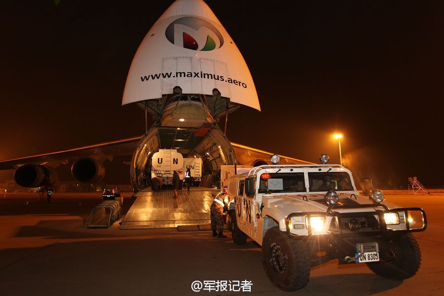 China's first team of peacekeeping battalion departs from east China's Shandong province, Jan. 8, 2015. The team consists of 24 soldiers. Six flew from Yaoqiang Airport in Jinan and 18 flew from Laishan Airport in Yantai. The six soldiers escorted materials and equipment in a An-124 cargo plane. (Photo/81.cn)