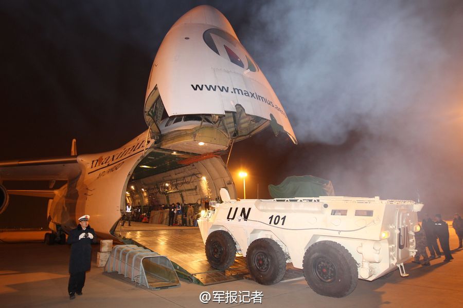 China's first team of peacekeeping battalion departs from east China's Shandong province, Jan. 8, 2015. The team consists of 24 soldiers. Six flew from Yaoqiang Airport in Jinan and 18 flew from Laishan Airport in Yantai. The six soldiers escorted materials and equipment in a An-124 cargo plane. (Photo/81.cn)