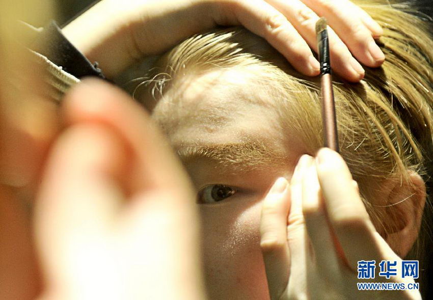 Wu Yuhang puts on makeup before the performance, Jan. 10, 2015. (Xinhua/Yue Yuewei)