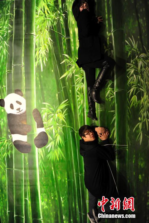 A couple climbs on the bamboo like a panda. (Chinanews/Zhai Yujia)