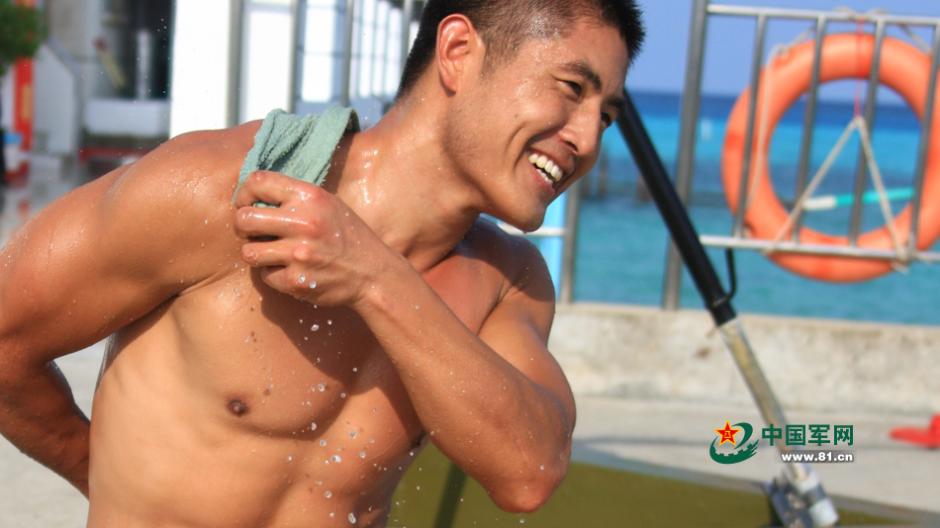 Li Huanle cools himself down after training on Nansha Islands. (Photo/81.cn)