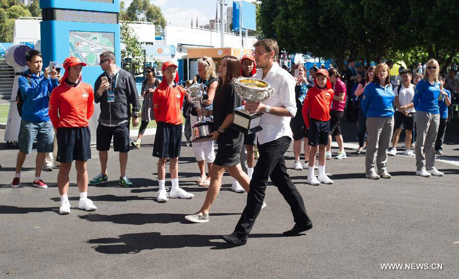 Li Na (center L) of China and Stan Wawrinka (center R) of Switzerland arrive at the official draw ceremony of 2015 Australian Open tennis tournament at Melbourne Park in Melbourne, Australia, Jan. 16, 2015. (Xinhua/Bai Xue)