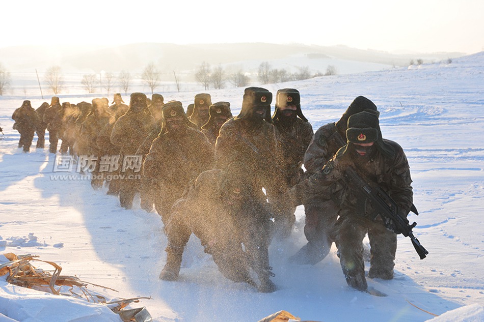 Soldiers march in snow.(Mod.gov.cn/Yang Dawei)