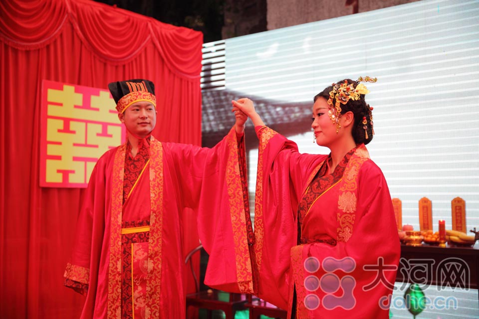 | A couple holds a traditional wedding ceremony wearing Hanfu (Han costume) in Heluo Town, Gongyi, central China's Henan Province, Jan. 14, 2015. The wedding ceremony was conducted in accordance with traditional wedding customs of the Zhou Dynasty, and all the wedding attendees wore Hanfu clothes. (dahe.cn/Fan Zhao) |