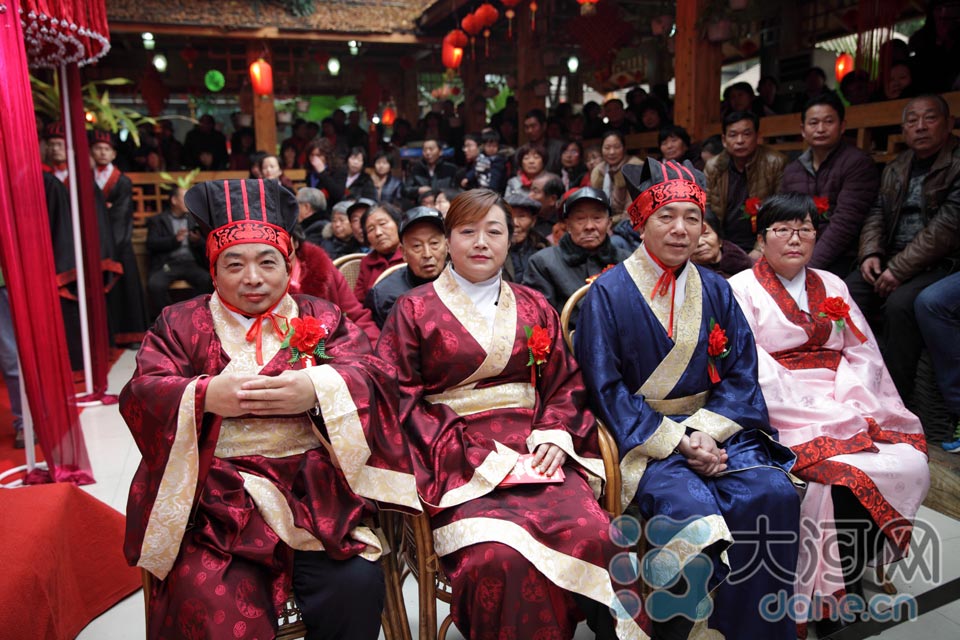 A couple holds a traditional wedding ceremony wearing Hanfu (Han costume) in Heluo Town, Gongyi, central China's Henan Province, Jan. 14, 2015. The wedding ceremony was conducted in accordance with traditional wedding customs of the Zhou Dynasty, and all the wedding attendees wore Hanfu clothes. (dahe.cn/Fan Zhao)