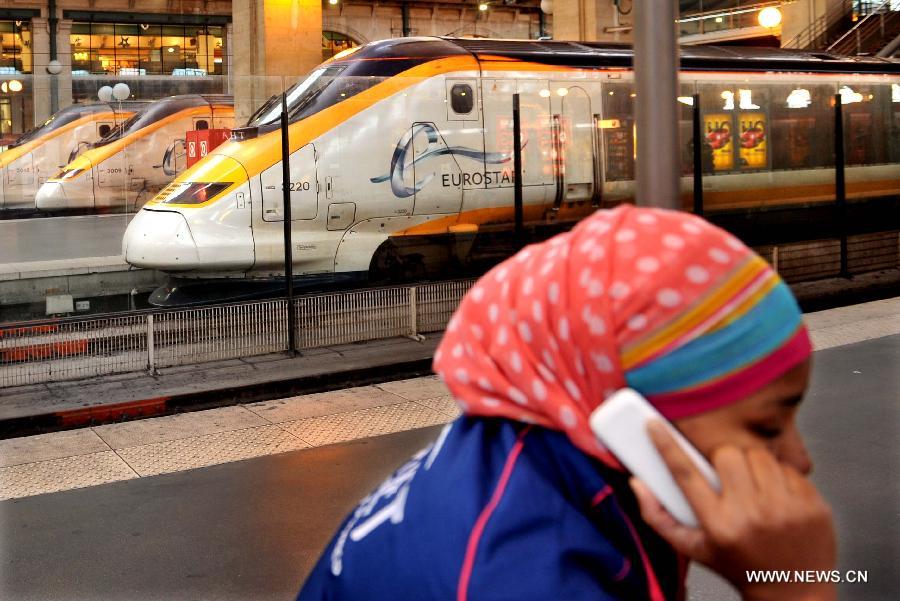 A passenger makes a phone call besides a Eurostar train at the Gare du Nord train station in Paris, France, Jan. 17, 2015. All services of Eurostar were suspended Saturday due to smoke detection in the Channel Tunnel, Eurostar announced Saturday. All trains were returning to original stations as the Channel Tunnel linking Britain and France was closed until further notice, Eurostar's customer care team said on its Twitter account. (Xinhua/Chen Xiaowei)