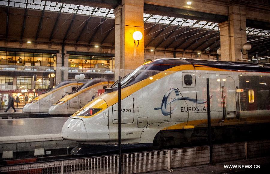 A Eurostar train parks at the Gare du Nord train station in Paris, France, Jan. 17, 2015. All services of Eurostar were suspended Saturday due to smoke detection in the Channel Tunnel, Eurostar announced Saturday. All trains were returning to original stations as the Channel Tunnel linking Britain and France was closed until further notice, Eurostar's customer care team said on its Twitter account. (Xinhua/Chen Xiaowei)