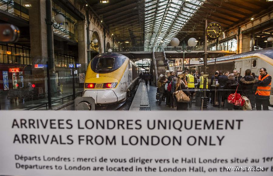 Passengers get off a Eurostar train that reversed from the Channel Tunnel due to a fire alarm at the Gare du Nord train station in Paris, France, Jan. 17, 2015. All services of Eurostar were suspended Saturday due to smoke detection in the Channel Tunnel, Eurostar announced Saturday. All trains were returning to original stations as the Channel Tunnel linking Britain and France was closed until further notice, Eurostar's customer care team said on its Twitter account. (Xinhua/Chen Xiaowei)