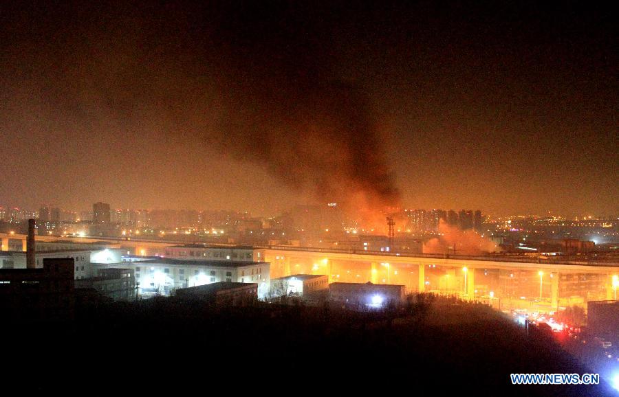 Photo taken on Jan. 17, 2015 shows a burning liquefied gas station which exploded after a tank truck caught fire in the Jinzhou District in Dalian, northeast China's Liaoning Province. The explosion caused 4 injures who were sent to hospital for treatments. (Xinhua)