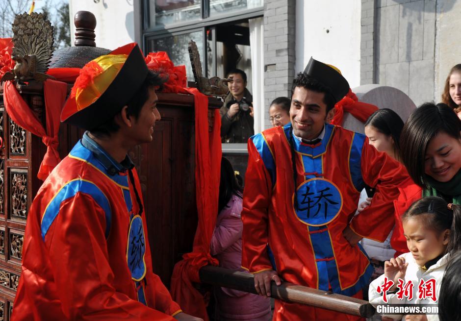 Over 100 college students from 26 countries gathered at the folk culture museum of Anhui Province to experience the traditional Chinese wedding of Qing dynasty on Jan. 18, 2015.