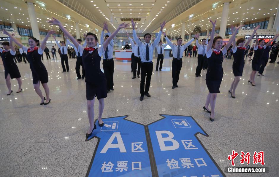 A flash mob, consisting of staff members in uniforms, welcomes passengers at Nanjing South Railway station , east China's Jiangsu province on Jan. 15, 2015. (CNS/Yang Bo)