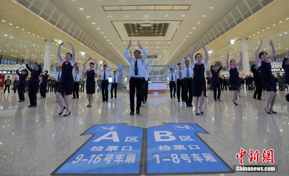 A flash mob, consisting of staff members in uniforms, welcomes passengers at Nanjing South Railway station , east China's Jiangsu province on Jan. 15, 2015. (CNS/Yang Bo)
