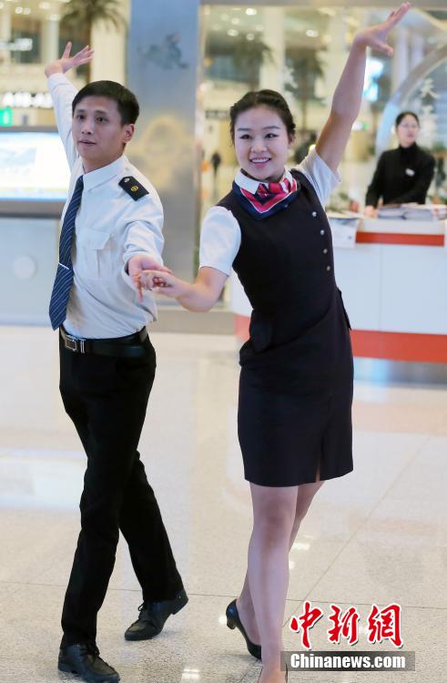 | A flash mob, consisting of staff members in uniforms, welcomes passengers at Nanjing South Railway station , east China's Jiangsu province on Jan. 15, 2015. (CNS/Yang Bo) |