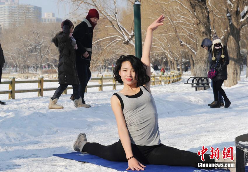 | A pole dancer shows her moves in snow in Changchun, capital of northeast China's Jilin province, Jan. 19, 2015. The temperature that day was minus 20 degrees Celsius. It is said that the dancer wanted to show the charm of pole dancing through her moves, and to break people's prejudices against the dance. (CNS/Zhang Yao) |